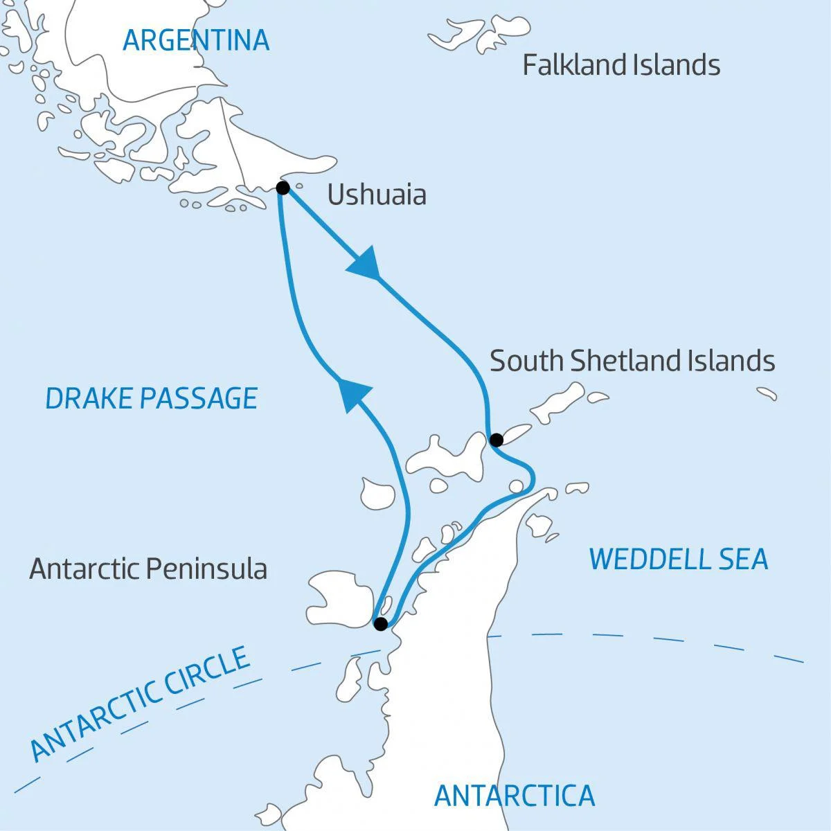 Antarctica Encompassed is the ultimate wildlife and wilderness adventure. The world’s most southerly city, Ushuaia, is where your journey will begin. Catch your first sight of land after the infamous Drake Passage when we reach the beautiful and history-rich South Shetland Islands before we sail on to South Georgia and the Falkland Islands. Endless wildlife viewing opportunities await –busy penguin colonies, sparring elephant seals, peaceful whales – while the contrasting landscapes en route will leave you breathless.